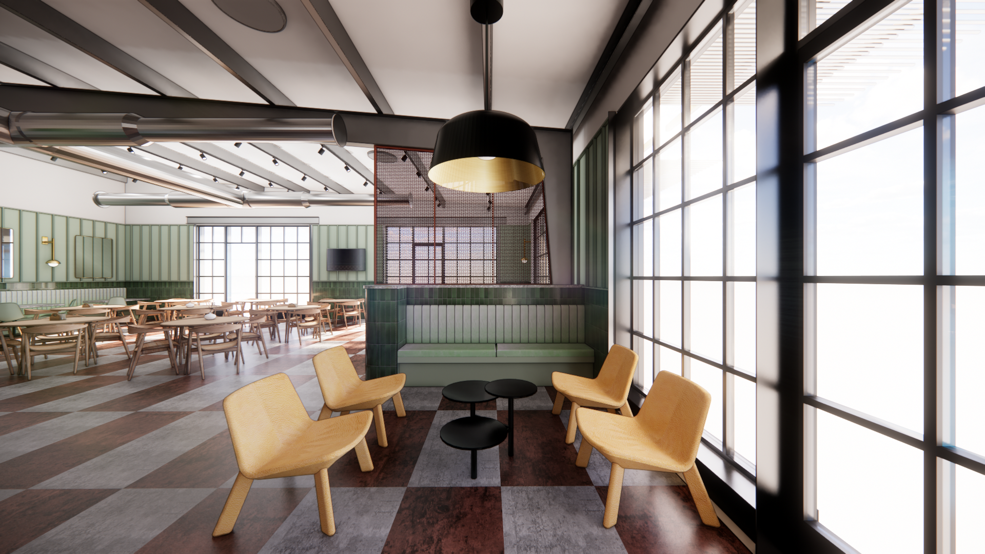 This interior finish of an existing prefabricated metal building helped rebrand Bella Donna sandwich shop by combining modern elements with a classic Italian design approach. The design features checkerboard patterns, the iconic colors of the Italian flag, and striping reminiscent of traditional Italian eateries. The result is a contemporary twist that brings a fresh and inviting atmosphere to the restaurant.