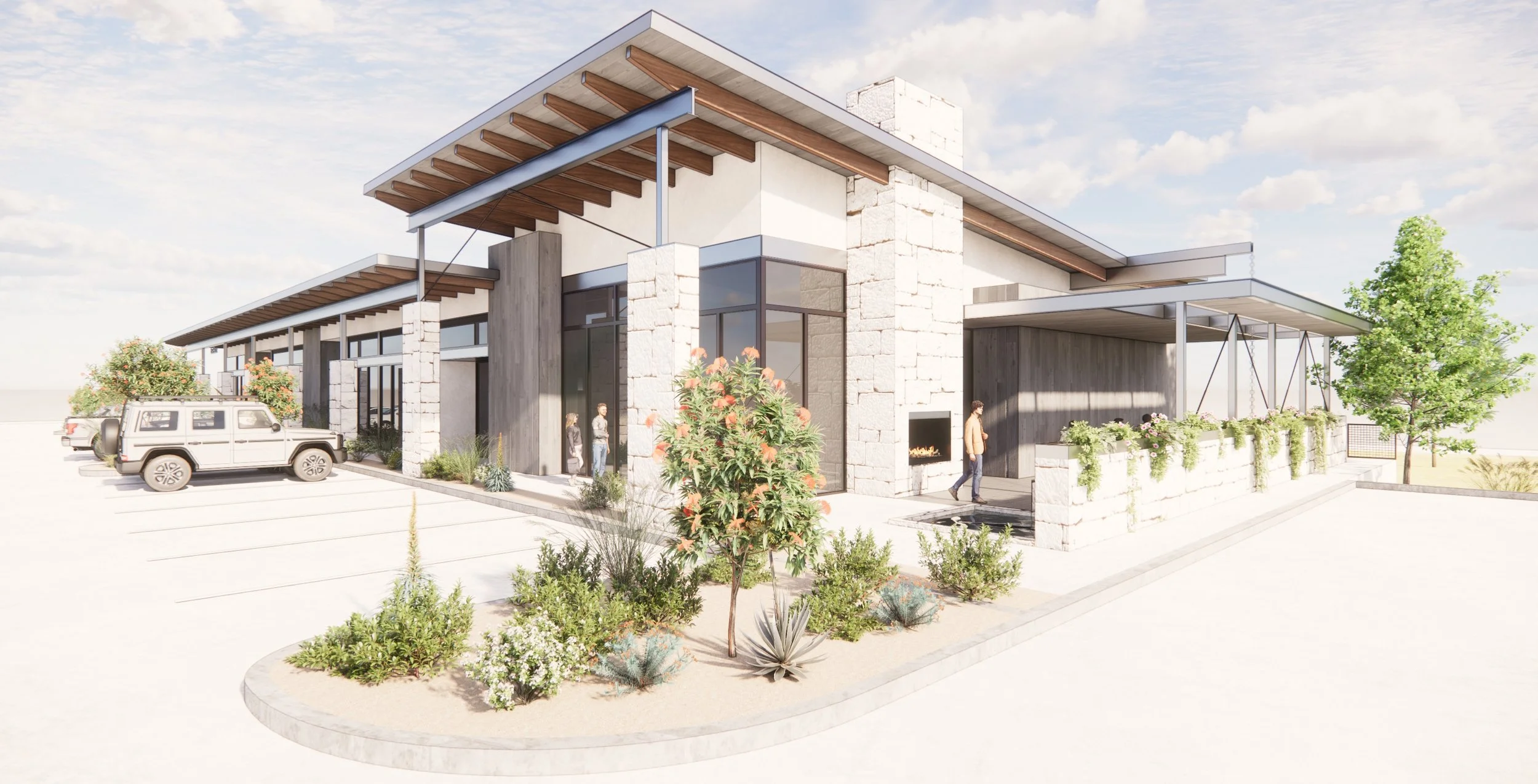 This mixed-use retail and restaurant building authentically captures the Texas ranch aesthetic through its exposed steel framework, substantial timber beams, vertically oriented weathered barn wood siding, and rough-cut oversized limestone. Designed for an arid climate, the architecture integrates sustainable features by harvesting rainwater via a distinctive butterfly-shaped roof that channels water into a raingarden. Thoughtfully designed landscaping envelopes the pathways and outdoor gathering areas, adding softness and vitality to the space.